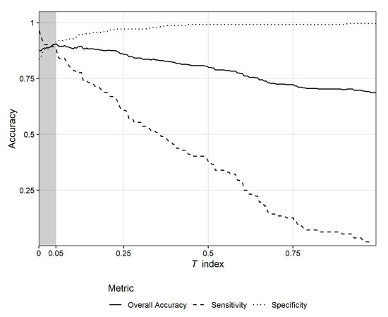 Second, we assessed the ability of T to detect random samples for different threshold values. At each threshold value, we computed to overall accuracy (percentage correct), the sensitivity (proportion of actual positives that are correctly identified as such) and the specificity (proportion of actual negatives that are correctly identified as such).