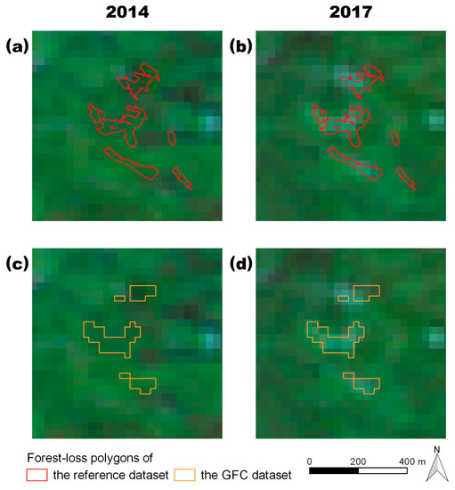 Examples of forest-loss polygons of (a,b) the reference dataset and (c,d) the GFC dataset with the Landsat composite images in (a,c) 2014 and (b,d) 2017 that cover between June 2014 and December 2016. The Landsat composite images were used only for visualization.