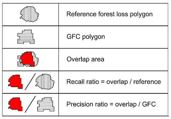 To quantify the accuracy of the GFC dataset in our study area, we used a method developed by Linke et al. [28]. We overlaid the forest-loss polygons of the reference data and GFC data and calculated the areas of overlap. We defined the ratio of the area of overlap of each GFC polygon to the entire area of the corresponding reference polygon as the “recall ratio”, and the ratio of the area of overlap of each GFC polygon with the corresponding reference polygon to the entire area of the GFC polygon as the “precision ratio” (Figure 4). We considered reference polygons with high recall ratios to have been detected in the GFC dataset, and GFC polygons with high precision ratios to have detected the forest loss of the reference data.