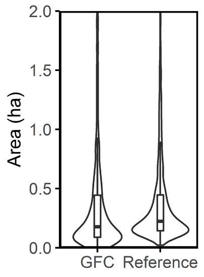 The GFC dataset within our study area contained 1141 forest-loss polygons with a total area of 586.7 ha. The reference data contained 1480 polygons with a total area of 780.0 ha. The mean areas of forest loss were 0.51 ha for the GFC dataset and 0.52 ha for the reference data. Although these means are almost the same, their distributions differ. The distribution in the GFC data was biased towards polygons of smaller area than those of the reference data (Figure 5). This difference might reflect the different intervals of data collection for the two sources: the reference data identified the forest loss over the two-year interval between the summers of 2014 and 2016, whereas the GFC data identified annual forest loss. Consequently, an apparently single period of forest loss in the reference data might be represented by more than one polygon in the GFC dataset.