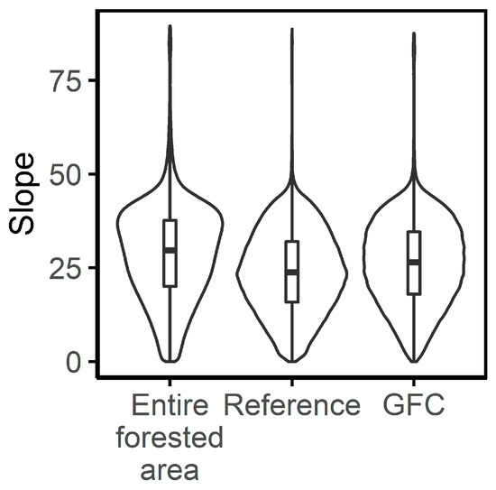 Comparison of violin and box plots of the distribution of slope for the entire forested part of the study area with the distributions for areas of forest loss during 2014 to 2016 derived from the reference and GFC datasets.