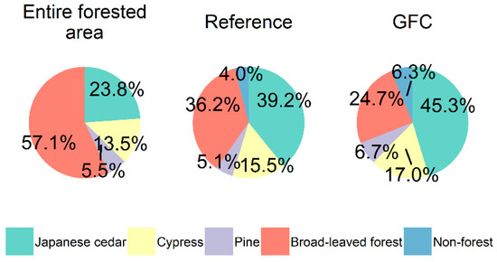 According to both the reference and GFC datasets, the proportions of the losses of Japanese cedar and cypress forest from 2014 to 2016 were considerably higher than their proportions in the entire forested area in 2014 (Figure 7). This difference is probably because these species are planted for timber production, so they are harvested more often than other species. The amount of broad-leaved forest loss was greater in the reference dataset than in the GFC dataset, which suggests that pre-existing forest species might influence the performance of the GFC dataset for detection of forest loss.