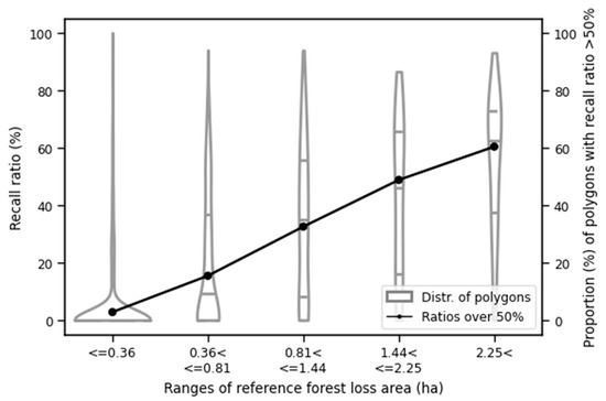 Comparison of violin plots of the distributions of recall ratios for forest-loss polygons in the reference dataset in five size ranges. Dashed horizontal lines show quartile and median values. For each size range, the black dots mark the proportion of forest-loss polygons successfully being detected (recall ratio >50%) in the reference dataset.