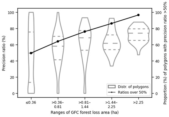 Our results for precision ratio presented higher accuracies. Of the forest-loss polygons from the GFC dataset, 57.3% had precision ratios >50%. Precision ratio improved with increasing polygon area, in particular in the uppermost two ranges of polygon size (Figure 9). In the lowest size range (<0.36 ha), 49.5% of GFC polygons had precision ratios >50%, but in the highest size range (>2.25 ha), 96.6% had precision ratios >50%. As was the case for recall ratio, the distributions of precision ratio demonstrated that larger GFC polygons returned better results. Success in the identification of forest loss from the GFC dataset on the basis of precision ratio was clearly superior to that measured by recall ratio, particularly for larger areas of forest loss. However, the greater predominance of smaller polygons in the GFC dataset compared to the reference dataset (Figure 5) may have compromised the overall results of detection of forest loss from the GFC data.