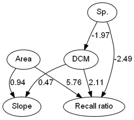 The relationship structure determined by our application of the DirectLiNGAM algorithm indicates that area of forest loss, DCM, and tree species directly affected the recall ratios we obtained (Figure 10). As noted in the preceding section, we showed that larger areas of forest loss were better identified by the GFC dataset. Higher mean DCM values and sharper crown forms also had positive effects on recall ratio. These results indicate that forest losses that provided large amounts of timber (i.e., large areas with high DCM) from major forestry species (Japanese cedar and Japanese cypress) were more easily detected in the GFC dataset. Slope had no immediate relationship with recall ratio in our study area, although both area of forest loss and DCM showed positive associations with slope. These associations can possibly be explained in terms of the profitability of forestry operations. If both the area of harvestable timber and the height of the canopy (DCM) were large, harvesting of forest stands might be economically viable even on relatively steep slopes.