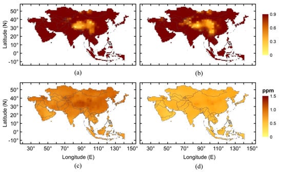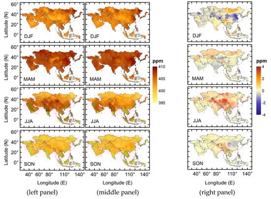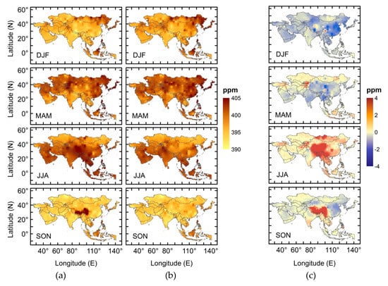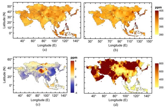 Asia experiences a monsoon climate, which plays a significant role in the CO2 concentrations [63]. Asian monsoon may be further classified into the Southwest Monsoon and the East Asian Monsoon [64]. The Southwest Monsoon mostly affects the Indian subcontinent and the East Asian Monsoon affects China, Japan, Philippines, Korea and Taiwan. The occurrence of the summer monsoons is a major source of precipitation and thus an important factor controlling the vegetation in these regions. Generally, March to May is treated as pre-monsoon, June to September as monsoon and October to November as post-monsoon in most of the Asian regions [63]. The CO2 concentration is found to be maximum in the pre-monsoon and minimum in monsoon (Figure 6c,d).