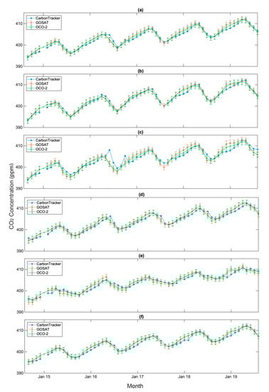 Figure 6 shows the monthly averaged XCO2 variations from CT and the two satellite datasets for 5 years starting from September 2014 to August 2019 over Asia (Figure 6a), Central Asia (Figure 6b), East Asia (Figure 6c), South Asia (Figure 6d), Southeast Asia (Figure 6e), and Western Asia (Figure 6f). All the data products show similarity in phases and amplitudes with some differences in the magnitude, which suggests a good agreement between the model and the satellite datasets. The CO2 concentrations over Central Asia (Figure 6b), East Asia (Figure 6c), and Southeast Asia (Figure 6e) are the highest in April and the lowest in August. It starts increasing in the fall, continues to increase in the winter, and reaches the maximum value in spring. In these regions, the heating systems are used in winter and spring which consume larger amounts of fossil energy, such as natural gas, oil, and coal, and thus produce a large amount of the CO2 which is discharged into the atmosphere. Moreover, in winter and spring, the plants are in the dormant and recovery stage. During this period, the strong respiration and the weak photosynthesis also contribute significantly to increasing the CO2 concentration in the atmosphere. The lower temperature in the winter inhibits the microorganism activity which hinders the decomposition process. The temperature starts increasing in the late spring, and it enhances the microorganism activity, thus the decomposition is started and CO2 is released from the biological materials. This might be the reason for the maximum concentration of the CO2 in April. The CO2 concentration decreases from May to August. During this period, the temperature, precipitation, and the lightning are beneficial to the vegetation growth which enhances the photosynthesis process. The strong presence of the photosynthesis by vegetation decays CO2 concentration [61,62]. Compared to the CT, GOSAT and OCO-2 show lower CO2 concentrations during the wet season (April-August) over these regions.
