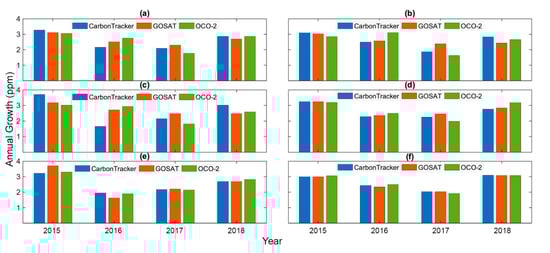 The annual growth rate has been computed by subtracting the mean from the mean of the next year. The annual growth of CO2 rate ranges from 0.98 to 3.28 ppm. It is important to note that in all the data products, the annual growth rate is relatively higher in 2015. This is because of 2015 El Niño which occurred in March 2015. El Niño–Southern Oscillation (ENSO), characterized by anomalous sea surface warming and cooling in the eastern and central Pacific is closely related to the growth rate of atmospheric CO2 [71]. Atmospheric CO2 growth rate is increased during El Niño and decreases during La Nina [72]. The computed growth rates are in agreement with the NOAA growth rates from CO2 surface observations [5] and the World Data Center for Greenhouse Gases (WDCGG) (https://gaw.kishou.go.jp/publications/global_mean_mole_fractions).