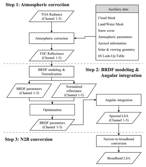 For polar orbit satellite, most LSA retrieval algorithm are divided into two types. One is a traditional algorithm that is composed of the most intuitive methods (atmospheric correction, BRDF modeling, and N2B conversion) for estimating LSA from satellite measurement. It is used in operating system for LSA retrieval from MODIS [17] and PROBA-V [18]. The other is a direct estimation algorithm. This algorithm produces directly LSA from single TOA reflectance without performing atmospheric correction and BRDF modeling to reduce the impact of errors occurring in each process of the traditional algorithm [15]. Nevertheless, atmospheric effect and surface BRDF are considered in the preparation of input data to establish the relationship between TOA reflectance and LSA [19]. This method was applied to the operational LSA retrieval algorithm for VIIRS [20] GLASS [5].