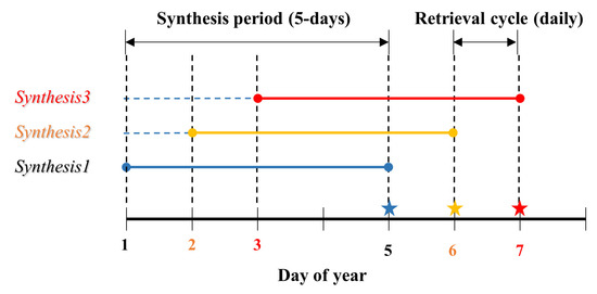 The empirical BRDF parameters can be calculated through BRDF inversion. For this, linear square regression was applied and the least three observations with various angular conditions in the clear sky are required. Unfortunately, AHI is not a multi-angle sensor; thus, we used time-series data accumulated within a short timeframe to retrieve BRDF parameters. The scheme for BRDF modeling in this algorithm is illustrated in Figure 3. We set the synthesis period to five days, considering the accuracy, processing efficiency, and ratio of the pixel with filling value due to a lack of observations. This period may be shortened, as we use observations measured every 10 min. BRDF modeling is performed with a daily sliding window, and BRDF parameters are retrieved every day. These results are assigned to the final date of the synthesis period.