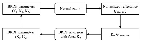 However, this method can constrain the BRDF inversion [70] and is not suitable when the surface condition changes rapidly or the prior knowledge is old. Therefore, in this study, we used normalized reflectance to minimize the errors in BRDF modeling. The normalized reflectance was estimated through the normalization method proposed by Yeom and Kim [71] (Equation 10), which considers the observation characteristics of the geostationary orbit (fixed viewing angles):