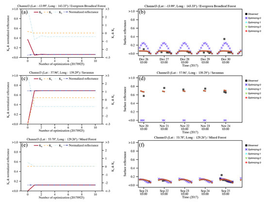The first row (Figure 5a,b) shows when the RMSE of BRDF modeling was reduced from 0.1208 to 0.0704 after optimization. As Figure 5a shows, before the optimization process, the value of K0 was abnormally high (almost 0.4), although this pixel’s land type is an evergreen broadleaf forest located in Northern Australia (tropical north). For this reason, the value of K2 was also abnormally high at over 3. Therefore, the TOC reflectance reproduced using the BRDF parameter without an optimization process shows a higher value than the typical reflectance for that land type, and the variation is also considerable. This error was caused by a cloud classification error that occurred on December 30 at 01:00 UTC (Figure 5b). After the optimization process, K0 and K2 decreased. The reproduced TOC reflectance showed better agreement with the TOC reflectance observed in cloudless conditions, and the variability was also reduced. This result showed that optimization processing can help to improve the quality of BRDF inversion when some observations are contaminated by clouds. The second row (Figure 5c,d) shows the results for snow-covered pixels located at high latitudes in the northern hemisphere. As shown in Figure 5d, all observations of the pixel were made at a similar local time. Therefore, the angle information sampled from this pixel was limited to a fixed view and a narrow solar geometry range (77.93–79.84°). In such cases, an error can occur when BRDF inversion is due to insufficient angular information [54]. In practice, as shown in Figure 5c,d, all three BRDF parameters calculated prior to optimization showed abnormal values, and the reproduced TOC reflectance was less than 0, indicating a value outside the valid range. The BRDF inversion result improved after the optimization process and showed similar improvements to the previous case. The last row (Figure 5e,f) shows the case when BRDF inversion RMSE was slightly increased after optimization from 0.0285 to 0.0369. Even before the optimization was performed, the TOC reflectance reproduced from the BRDF parameters appeared to simulate the surface anisotropy reflectance of the observed TOC reflectance. Even before the optimization was performed, the reproduced TOC reflectance closely simulates the surface anisotropy characteristics of the observed TOC reflectance (Figure 5f). Nevertheless, K0 has a negative value outside the valid range, as shown in Figure 5e. After optimization, K0 showed a positive value, and the reproduced TOC reflectance closely simulated the observation TOC reflectance prior to optimization.