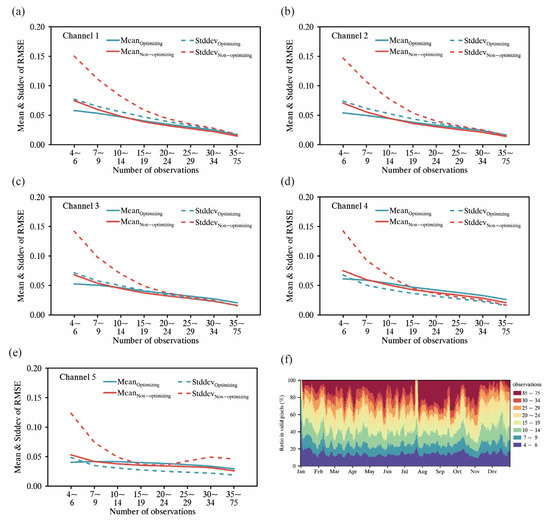(a–e) The mean (solid line) and standard deviation (dashed line) of RMSE in BRDF modeling before (red) and after (blue-green) optimization process according to the number of observations in the BRDF composite period for 5 channels (a–e). (f) The ratio of the number of observations to all valid pixels throughout 2017.