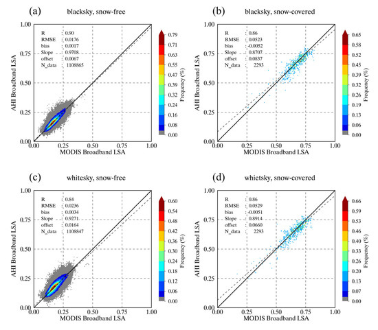 The broadband LSA derived from AHI was compared to that from MODIS. Figure 7a,c show the difference in broadband LSA estimated from AHI and MODIS for black-sky and white-sky under snow-free conditions. Most pixels were located close to the 1:1 line. Although the AHI broadband LSA values are generally higher than those of MODIS, with the positive bias of 0.0017 for black-sky and 0.0034 for white-sky, they are negligible and generally show good agreement overall. The validation metrics of black-sky (RMSE of 0.0176, bias of 0.0017, and R of 0.90) showed slightly improved results compared to those of white-sky (RMSE of 0.0236, bias of 0.0034, and R of 0.84). Moreover, each point of white-sky is more widely distributed from the diagonal than those of black-sky. Figure 7b,d show comparison results of broadband LSA in snow-covered pixels. Most of pixels are located close to the 1:1 line and show good agreement overall. The higher RMSE that is 0.0523 for black-sky and 0.0529 for white-sky in snow-free conditions is reasonable when the high broadband LSA of the snow-covered pixels is considered [3,81]. Unlike the comparison results for snow-free conditions, AHI broadband LSA was lower than that of MODIS with a negative bias of -0.0052 for black-sky and −0.0051 for white-sky. The accuracies of snow-covered pixels for black-sky and white-sky were similar with close validation metrics (RMSE, bias, and R). Consequently, these results indicate that black-sky and white-sky AHI broadband LSA agree well overall with MODIS broadband LSA, which was well validated in both snow-free and snow-covered conditions, although some differences are evident between these sensors, such as cloud detection, snow cover detection, the synthesis period of BRDF modeling, spectral information, and angular sampling.