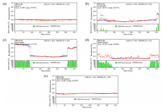 In the further analyses, with the exception of time-series analyses, only MODIS and AHI broadband LSA with “good” quality flags were used. The different LSA estimation strategies for snow-covered pixels between AHI and MODIS can also present a difference in broadband LSA [18]. To minimize the error caused by this, when the pixel was snow-covered throughout the entire BRDF modeling synthesis period, it was used to validate snow-covered broadband LSA. However, if the pixel showed no snow cover throughout the entire BRDF modeling synthesis period, it was used for snow-free broadband LSA validation.