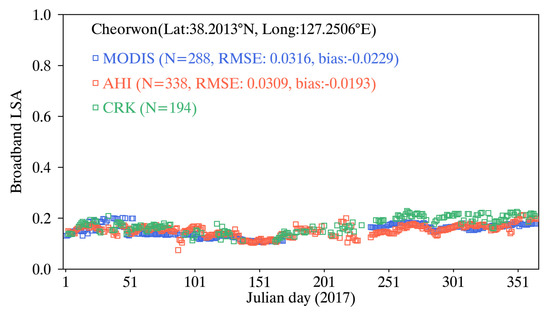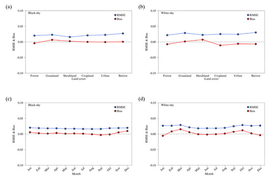 The broadband LSA varies somewhat according to land type and time. The AHI broadband LSA was compared to that of MODIS for some land types and months (Figure 10). The forest type indicates that all five land types (evergreen broadleaf, evergreen needle-leaf, deciduous broadleaf, deciduous needle-leaf, and mixed forest) are combined into one. Both black-sky and white-sky exhibit low RMSE (from 0.0157 to 0.0270 in black-sky and from 0.0216 to 0.0302 in white-sky) and bias (from −0.0042 to 0.0066 in black-sky and from −0.0117 to 0.0014 in white-sky) for all land types (Figure 10a,b). The variation in bias in different land types was slightly greater in white-sky than black-sky, but it was nonetheless negligible. In Figure 10c,d, the RMSE between AHI and MODIS broadband LSA was almost stable in black-sky (from 0.0160 to 0.0203), while the monthly RMSE in white-sky showed a slightly larger variation according to time (from 0.0180 to 0.0287). The reason for this error tendency may be that the error generated in the atmospheric correction and BRDF modeling step was amplified by the integration of the BRDF kernel for the SZA to calculate the white-sky spectral LSA [32]. Nevertheless, both black-sky and white-sky show reasonable differences with an RMSE smaller than 0.05.