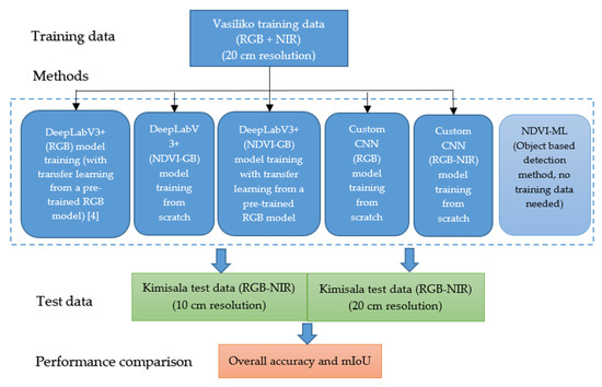 We first introduce the dataset in Section 2.1 followed by the two deep learning methods and our object-based vegetation detection method, NDVI-ML, in Section 2.2, Section 2.3 and Section 2.4. A block diagram of the used dataset and the applied methods in this paper can be seen in Figure 1.