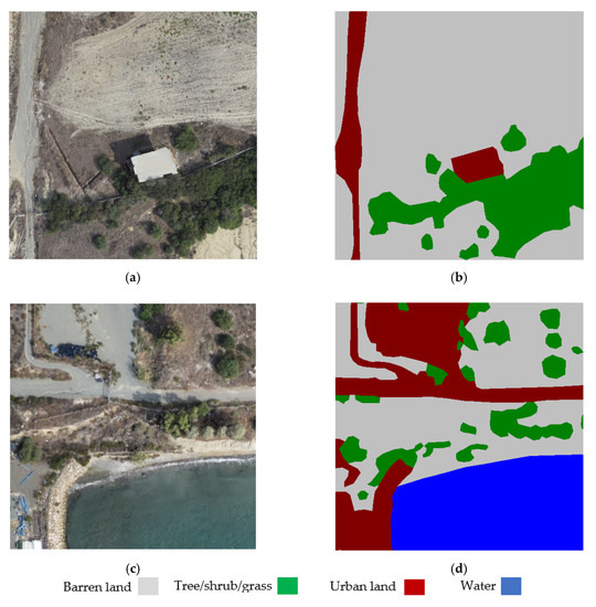 Sample images from Vasiliko dataset and their annotations (silver color corresponds to barren land, green color corresponds to tree/shrub/grass, red color corresponds to urban land, and blue color corresponds to water in land cover map annotations). (a) Color image for mari_20_3_8; (b) ground truth land cover map for mari_20_3_8; (c) color image for mari_20_42_4; (d) ground truth land cover map for mari_20_42_4.