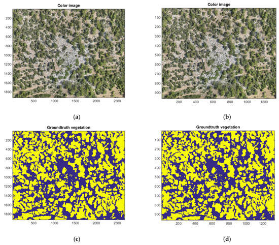 This site is part of the Kimisala area in the southwestern part of the island of Rhodes and contains many scattered archaeological sites. Regarding the Kimisala image used in the investigations, it corresponds to an area of ~0.05 km2. There are two images of the same site with two different resolutions (10 cm per pixel and 20 cm per pixel). In the Kimisala test images, land covers in the form of trees, shrubs, barren land, and archaeological sites are present. These land covers are categorized into two major land cover classes which are vegetation (tree/shrub) and non-vegetation (barren land and archaeological site). The 10 cm resolution Kimisala test image is annotated with respect to the two land covers (vegetation and non-vegetation). The land cover map for the Kimisala-20 test image is generated by resizing the annotated land cover map generated for the Kimisala-10 test image. The color Kimisala images for the 10 and 20 cm resolutions and their land cover annotations can be seen in Figure 3. It is worth mentioning that the Kimisala-10 test image is 1920 × 2680 in size and the Kimisala-20 test image is 960 × 1340 in size. Both test images are split into non-overlapping 512 × 512 image tiles when testing with the trained DeepLabV3+ models with the exception of the tiles that form the last portion of the rows and columns of the image in which there is a slight overlapping. In the ground truth and estimated land cover maps for the Kimisala test images, a yellow color is used to annotate vegetation and a blue color is used to annotate non-vegetation land covers.
