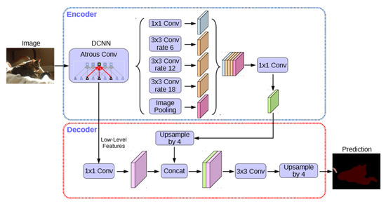 - Chen, L.C.; Zhu, Y.; Papandreou, G.; Schroff, F.; Adam, H. Encoder-decoder with atrous separable convolution for semantic image segmentation. In Proceedings of the European Conference on Computer vision (ECCV), Munich, Germany, 8–14 September 2018; pp. 801–818. [Google Scholar]