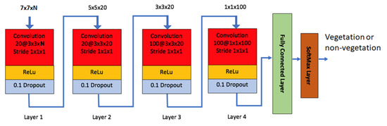 We used the same structure for the CNN model as in our previous work [38] for soil detection, except the filter size in the first convolution layer changed accordingly to be consistent with the input patch sizes. The input image with N bands is extracted into 7 × 7 image patches each with a size of 7 × 7 × N. These image patches are input to the CNN model. For the case when RGB image bands are used, N is 3 and when the NIR band is included, N becomes 4. The CNN model has four convolutional layers and a fully connected layer with 100 hidden units. The CNN model structure is shown in Figure 5. The 3D convolution filters in the convolutional layers are set to 3 × 3 × N in the first convolutional layer, 3 × 3 × 20 in the second and third layers and to 1 × 1 × 100 in the fourth layer. The naming convention used for the convolutional layers in Figure 5 indicates the number of filters and the filter size. As an example, 20 @ 3 × 3 × N, in the first layer indicates 20 convolutional filters with a size of 3 × 3 × N. The stride in all four convolution layers is set to 1 (shown as 1 × 1 × 1) meaning the convolution filter is moved one pixel at a time in each dimension. When we designed the network, we tried different configurations for the number of layers and the size of each layer and selected the one that provided the best results. We did this for all the layers (convolutional and fully connected layers). The choice of “100 hidden units” in the fully connected layer was the outcome of our design studies.