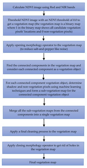 We developed an object-based vegetation detection method, NDVI-ML, which utilizes NDVI [44], machine learning (ML) techniques for classification and computer vision techniques for segmentation. The block diagram of NDVI-ML can be found in Figure 6.