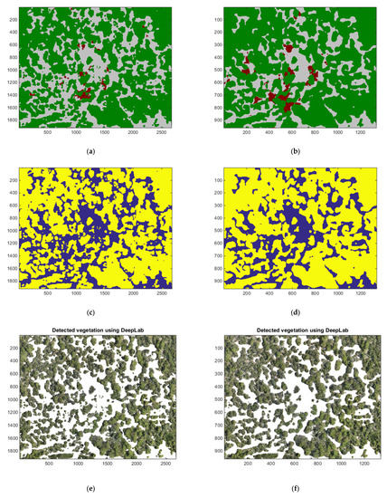 In our recent work [5], DeepLabV3+ models were trained using RGB color images of three datasets, which are the Slovenia [36], DeepGlobe datasets [37], and Vasiliko dataset and the trained models were all tested on the Kimisala test data. For completeness of this paper, the DeepLabV3+ results with these three datasets are shown in Table 4. Due to significant resolution differences between the training data (Slovenia data: 10 m resolution; DeepGlobe: 0.5 m resolution) and the testing data (10 cm and 20 cm), the results of these two DeepLabV3+ models on the Kimisala test dataset were found very poor. Table 4 shows the performance metrics obtained with the three DeepLabV3+ models which are trained using three different datasets of different image resolutions and image capturing hardware for the Kimisala-10 test image. It can be noticed that the model trained with the Vasiliko dataset has the highest detection scores. The DeepLabV3+ model trained with Vasiliko dataset also provided the best performance on the Kimisala-20 test image. The resultant performance metrics for the Kimisala-20 test image with three DeepLabV3+ models can be seen in Table 5. The detection results for the two Kimisala test images using the DeepLabV3+ model trained with the Vasiliko dataset and the estimated vegetation maps can be seen in Figure 7. In the DeepLabV3+ results shown in Figure 7a,b, green color pixels correspond to tree/shrub/grass, the silver color corresponds to the barren land and the red color corresponds to urban land).