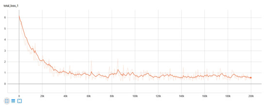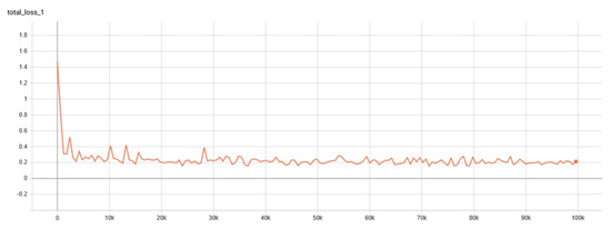 Next, we used the same NDVI-GB training data set and used the pre-trained model’s weights (pre-trained model for PASCAL VOC 2012 dataset for RGB images) to initialize our training model’s weights. Even though the training dataset has the NDVI bands instead of red (R) band, the total loss converged nicely during training as can be seen in Figure 9 and the detection results also improved slightly for both Kimisala test datasets in comparison to the results using the DeepLabV3+ model trained using RGB bands. The results for the two Kimisala test datasets can be seen in Table 6. Considering that an RGB-based pre-trained model is used as the initial model whereas the training dataset does not contain the R band but NDVI instead, it is found highly interesting that slightly better detection results can be still obtained.