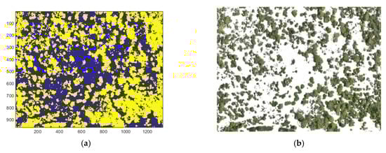 CNN vegetation detection results for the Kimisala-20 test image using the CNN model trained with the Vasiliko dataset. (a) Estimated vegetation binary map Kimisala-20 using CNN (yellow: Vegetation, blue: Non-vegetation); (b) detected vegetation using CNN for Kimisala-20.
