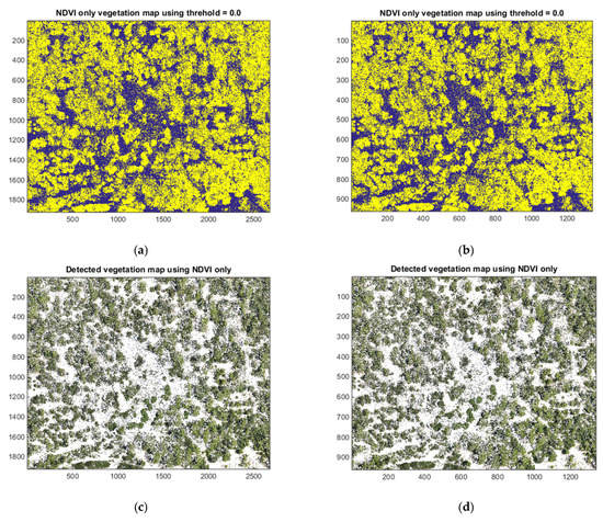 NDVI only (threshold = 0) vegetation detection results for the two Kimisala test images. (a) NDVI-only estimated vegetation map (Kimisala-10) (yellow: Vegetation, blue: Non-vegetation); (b) NDVI-only estimated vegetation map (Kimisala-20) (yellow: Vegetation, blue: Non-vegetation); (c) Detected vegetation with NDVI only (Kimisala-10); (d) Detected vegetation with NDVI only (Kimisala-20).