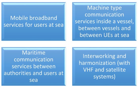 Currently, 3GPP is considering and developing a system specifically for maritime communications for Release 16 and beyond to support the needs of future maritime users [37,40]. One of the requirements of this “cellular-Maritime” system is to support up to 100 km coverage. It will also support the interworking between the 3GPP system and the existing/future maritime radio communication system for the seamless service of voice communication and data communication between users ashore and at sea or between vessels at sea. Use cases have been grouped into four main use case categories presented in Figure 1.