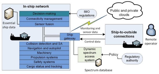 - Höyhtyä, M.; Huusko, J.; Kiviranta, M.; Rokka, J.; Solberg, K. Connectivity for autonomous ships: Architecture, use cases, and research challenges. In Proceedings of the International Conference of ICT Convergence (ICTC), Jeju Island, Korea, 18–20 October 2017. [Google Scholar] [CrossRef]