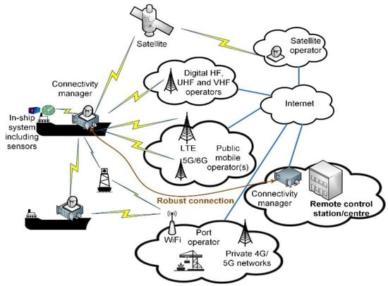 A crucial enabler for smart ships both in local waters and in global operations will be connectivity [5,6,7,8]. A good connection with a latency that is low enough also enables telexistence, i.e., the real-time sensation of being at a ship from a shore, and being able to interact with the remote environment [9]. The connectivity solution has to guarantee sufficient communication link capacity for sensor monitoring and remote control. Connectivity between the ship and the shore is crucial to enable human inputs and remote operations. Communication needs to be bidirectional, secure, scalable and redundant to minimize risks.