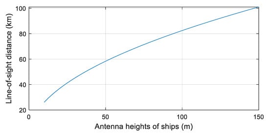 The maximum LoS distance for ship-to-ship communications when both ships are equipped with identical antenna heights is shown in Figure 4.