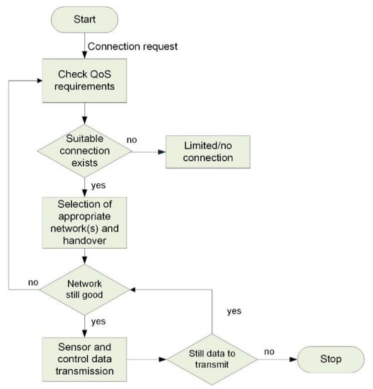 Vertical handover (VHO) means switching from one wireless radio technology to another, e.g., from the WiFi network to the LTE network or from a satellite connection to the mobile operator network. It is an essential part of the connectivity management, enabling connection to continue even when the vessel moves out from the coverage area of certain network or, e.g., when a certain frequency is intentionally jammed. The VHO procedure should be performed so that the required QoS level is maintained before the handover, during the handover, and after the handover. We will shortly describe how to perform VHO in the described integrated connectivity architecture. The proposed high-level logic is presented in Figure 5.