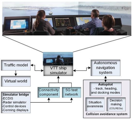 Various simulators are used in the maritime field to train personnel in navigation, ship handling and the use of ship bridge equipment. Simulators typically consist of real equipment, real consoles, and instrumentation while the ship and its environment are virtual [52,53]. Autonomous navigation systems (ANS), which can make navigational decisions and command the ship’s propulsion systems, represent a central part of autonomous or remote-controlled vessels.