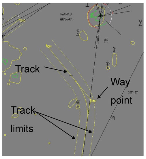 A wide-speed-range autopilot is utilized to maneuver the vessel through the desired course. The autopilot consists of the heading, track and docking modes. The heading mode tries to keep the given heading angle at the given speed, that is, it is a Proportional Integral Derivative (PID)-based heading controller [54]. Moreover, the track mode keeps the vessel in the given track, as shown in Figure 8.