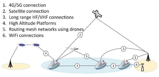 Vessels will provide the navigational information and dynamic information of their speed and movements via the standardized system. Interworking and harmonization with VHF and satellite access include a VHF data exchange system (VDES) to digitalize VHF communications. In addition, integrated satellite–terrestrial 5G systems [41] aim to provide services to maritime and other users globally in the future. Both direct access to satellite using the 5G interface as well as indirect access are included in the development [42].