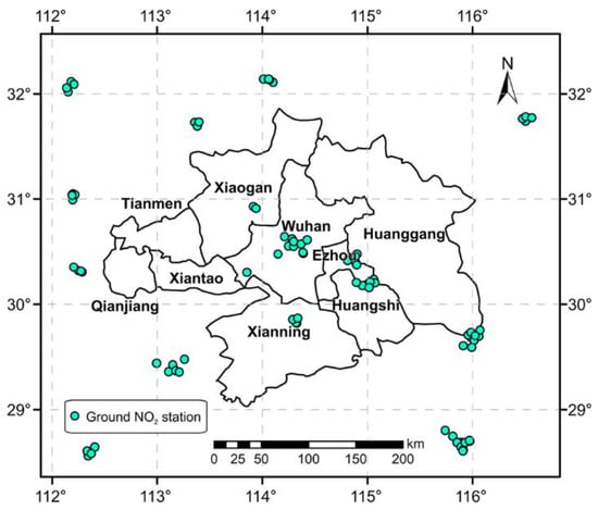 The Wuhan urban agglomeration (WUA) region was selected as the study area, which is displayed in Figure 1. The WUA region is situated in the central part of China. It consists of the Wuhan city and eight surrounding cities, i.e., Ezhou, Huangshi, Xianning, Xiaogan, Huanggang, Tianmen, Qianjiang, and Xiantao [25]. In recent years, the WUA region is suffering from a severe air pollution problem, due to the rapid development of the economy [26,27]. Hence, it is of considerable significance to dynamically monitor ground NO2 concentrations in the WUA region.