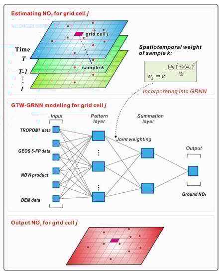 In this research, the generalized regression neural network (GRNN) [32,33] model is utilized for mapping the relationship between ground NO2 and influencing factors, that is, is represented by the GRNN model. Figure 2 shows the schematic of the space-time varying GRNN model for ground NO2 estimation, which is denoted as geographically and temporally weighted GRNN (GTW-GRNN). The GTW-GRNN model is separately constructed for each location and time, and the modeling process contains two main steps, i.e., spatiotemporal weighting and GRNN modeling, which are simply described as follows. For details, please refer to our previous study [34].
