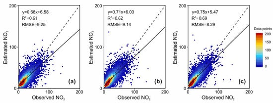 Secondly, large seasonal variations can be found in Table 1, where summer shows the most miserable performance, and autumn and winter report significant increase for model fitting goodness. Taking the GTW-GRNN model as an example, the RMSE, R2, and slope values are 6.28 μg/m3, 0.34, and 0.48, respectively, for summer, whereas the corresponding metric values are 10.27 μg/m3, 0.64, and 0.70, apiece, for winter. A higher slope value generally means a lighter degree of underestimation/overestimation, so the models tend to better estimate NO2 high/low values in winter than in summer. Besides, it should be noted that winter has a higher RMSE value than other seasons. RMSE value is an absolute metric and the high level of NO2 concentrations in winter results in the high RMSE value. The reason for seasonal variations could be related to seasonal differences of NO2 values, formation conditions, etc.