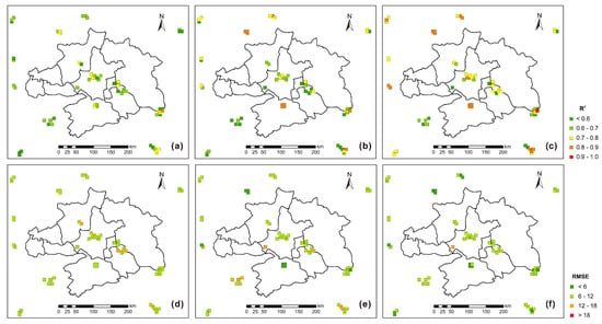 Site-based CV performance for each grid cell. (a–c) are R2 distributions for the GTWR, global GRNN, and GTW-GRNN models, respectively. (d–f) are RMSE distributions for the GTWR, global GRNN, and GTW-GRNN models, respectively.