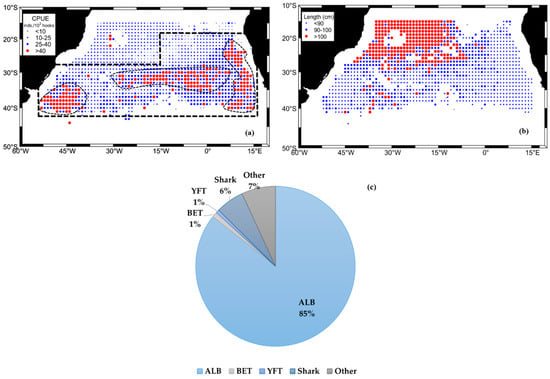 Study area: (a) geographical distribution of albacore tuna in nominal catch per unit effort (CPUE) (dashed line represents feeding ground and dashed circle denotes CPUE > 40); (b) average length distribution; and (c) catch composition (% of total catch) for Taiwanese large-scale longliners during 2009–2015 in the Southern Atlantic Ocean (SAO).