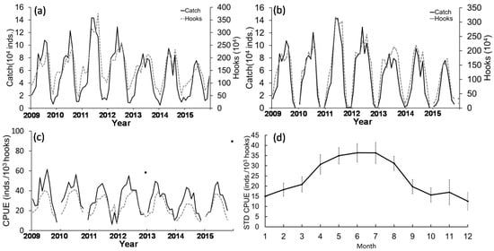 No significant bycatch (more than 85% of the catch was detected as the target fish; Figure 1c) was assumed [], and CPUE (individuals/1000 hooks) of the tuna longline fishery fleets was considered a reliable indicator of stock relative abundance in the fishing regions [,,]. Monthly nominal CPUE was computed as the number of fish captured per 1000 hooks (individuals/103 hooks).