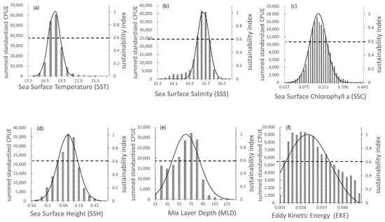 We assumed SST to be the principal factor for defining the habitat for albacore according to studies on the association between environmental variables and albacore catch []. We then applied different forward combinations of two to six variables as habitat data in each empirical habitat model. SI values > 0.6, obtained from various integrations of habitat factors, were then incorporated into the HSI model [].