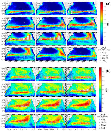 Monthly HSI predicted maps and albacore standardized CPUE using (a) an AMM model with SST and SSC data, and (b) an AMM model with SST, SSH, and EKE data. Open circles denote the scale of average CPUE standardization.