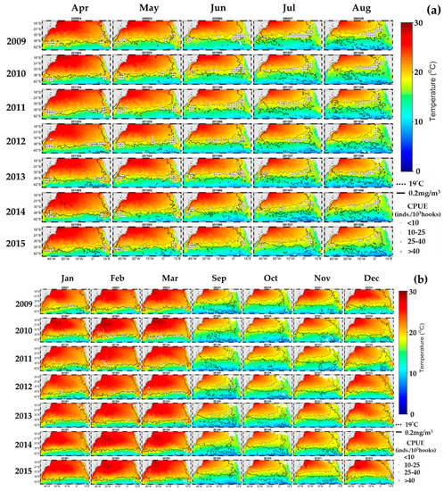 Annual geographical distribution of albacore CPUE associated with SST and SSC (a) during April to August (main fishing season) and (b) other months. The dotted line represents the 19 °C SST isotherm, and the black lines represent the 0.2 mg/m3 SSC isopleth in the current month and time delay of 1 month, respectively.