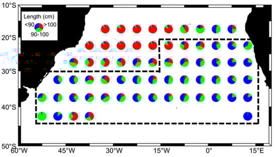 SST is widely accepted as a key predictor of CPUE for albacore tuna [,,] due to its relation to albacore distribution limits. Moreover, migration is triggered by food availability, which is mainly indicated by SSC and optimal SST [,,,]. Recent findings have demonstrated that SST and SSC play significant roles in most abundance models of albacore distribution [,,,]. The length distribution of albacore tuna (Figure 8) highlighted the potential of feeding grounds of immature albacore near the temperate to subtropical area, which is as a function of the SST front []. It also specifies the spawning grounds around northwest subtropical to tropical waters, where lower food concentration in surface waters and high temperature are defined as suitable for spawning []. Furthermore, the distribution, migration, and catchability of tuna may be closely related to oceanic eddies and fronts [,,,]. However, albacore preferred different optimal ranges of MLD (45–105 m; Figure 4e), which may confirm daily or latitudinal vertical migration was derived through food availability [,,] appearing in deeper mixed layer during the day and deeper waters at lower latitude [].