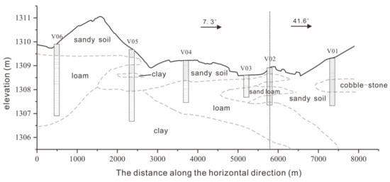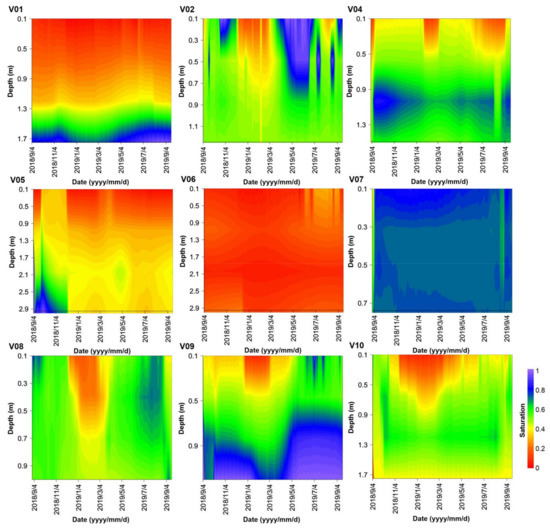 As is shown in Figure 7, the variation of saturation at each location (except V06) was similar. The saturation of surface soil at each location was low, while the saturation of deep soil at each location was high. The saturation at the V02, V04, V07, V08, and V09 locations, which are closer to the lake, was low from January to March, and increased after March as the surface soil water melted. The conditions described are consistent with the variation characteristics of the groundwater level.