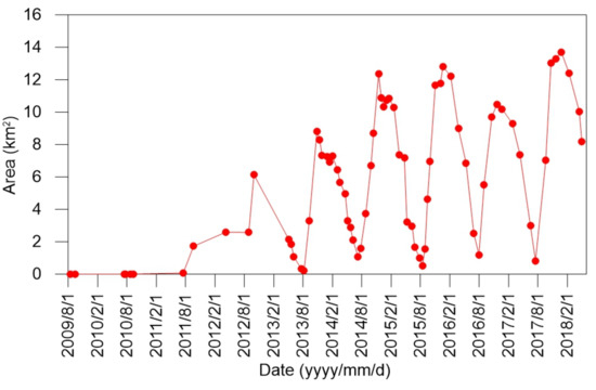Since September 2010, the ecological waters have been transferred from the reservoir to Qingtu Lake from September to October each year [40]. The surface area of the water body of Qingtu Lake exhibited a dynamic change trend (Figure 3). The lake water body reached the largest surface area from November to the following January, with a maximum area of 13.7 km2. It normally exhibits the lowest area from July to August each year.